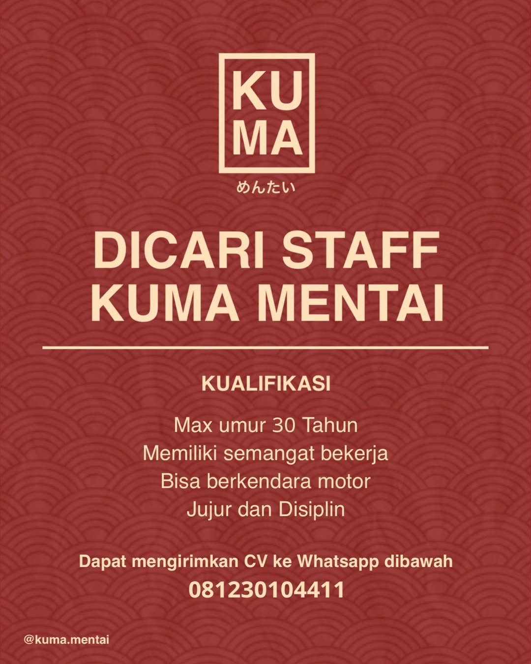 LOKER.BALINEWS.ID, BALI – Kuma Mentai, salah satu gerai kuliner spesialis mentai yang sedang berkembang, saat ini tengah mencari talenta baru untuk bergabung sebagai Staff Toko. Perusahaan mengundang individu yang memiliki etos kerja tinggi dan dedikasi untuk memberikan pelayanan terbaik kepada pelanggan di outlet mereka. Bergabung dengan Kuma Mentai memberikan kesempatan bagi para pencari kerja untuk berkarir di lingkungan industri makanan dan minuman yang dinamis.