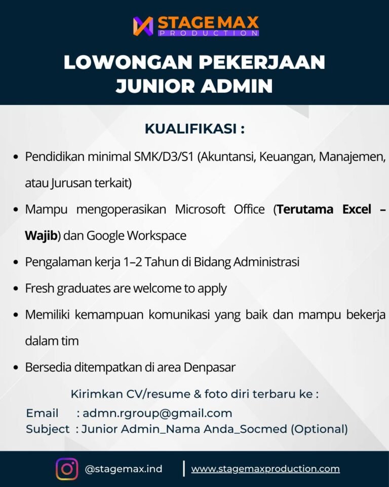 LOKER.BALINEWS.ID, DENPASAR – Stage Max Production, salah satu perusahaan yang bergerak di bidang produksi event, saat ini tengah membuka peluang karir bagi tenaga profesional muda untuk mengisi posisi Junior Admin di area Denpasar. Lowongan ini terbuka bagi lulusan minimal SMK, D3, atau S1 khususnya dari jurusan Akuntansi, Keuangan, Manajemen, atau bidang terkait lainnya. Pihak perusahaan mengutamakan kandidat yang mampu mengoperasikan Microsoft Office, terutama mahir dalam menggunakan Excel, serta terbiasa bekerja dengan platform Google Workspace.