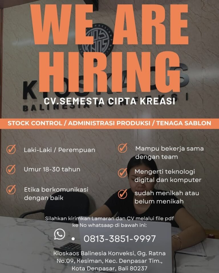 LOKER.BALINEWS.ID, DENPASAR – CV. Semesta Cipta Kreasi yang bergerak di bidang konveksi dan sablon dengan brand Kioskaos Balinesia saat ini membuka lowongan kerja di Bali untuk beberapa posisi produksi. Kesempatan ini terbuka bagi pria maupun wanita usia produktif yang memiliki etika komunikasi yang baik, mampu bekerja dalam tim, serta memahami teknologi digital dan komputer.