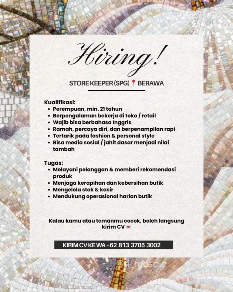 Melalui rekrutmen Lowongan Kerja Bali Store Keeper SPG Berawa ini, kandidat akan bertugas melayani pelanggan, memberikan rekomendasi produk, menjaga kerapihan dan kebersihan butik, mengelola stok dan kasir, serta mendukung operasional harian. Kemampuan menggunakan media sosial atau keahlian jahit dasar menjadi nilai lebih. Butik mengutamakan kandidat yang disiplin dan siap bekerja di lingkungan retail yang dinamis. Pelamar yang merasa sesuai diimbau untuk segera mengirimkan CV melalui kontak WhatsApp yang tercantum agar dapat mengikuti tahapan seleksi berikutnya.