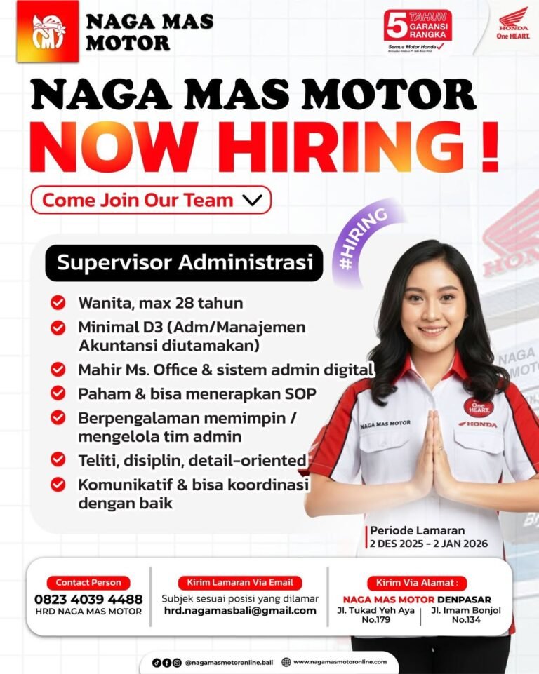 LOKER.BALINEWS.ID, DENPASAR – Naga Mas Motor, salah satu dealer resmi Honda yang telah dikenal di Bali, membuka kesempatan kerja untuk posisi Supervisor Administrasi. Lowongan ini ditujukan bagi pelamar wanita usia maksimal 28 tahun, dengan pendidikan minimal D3, diutamakan lulusan Administrasi, Manajemen, atau Akuntansi.