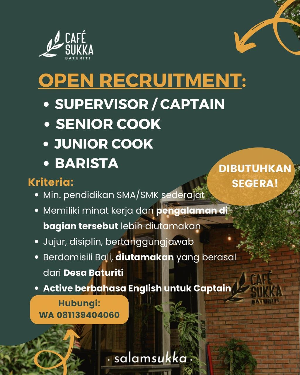 LOKER.BALINEWS.ID, TABANAN – Café Sukka Baturiti saat ini membuka lowongan kerja Bali untuk beberapa posisi, yaitu Supervisor/Captain, Senior Cook, Junior Cook, dan Barista. Kesempatan ini terbuka bagi kandidat dengan pendidikan minimal SMA/SMK sederajat yang memiliki minat kerja serta pengalaman di bidang masing-masing, dengan pengalaman menjadi nilai tambah.