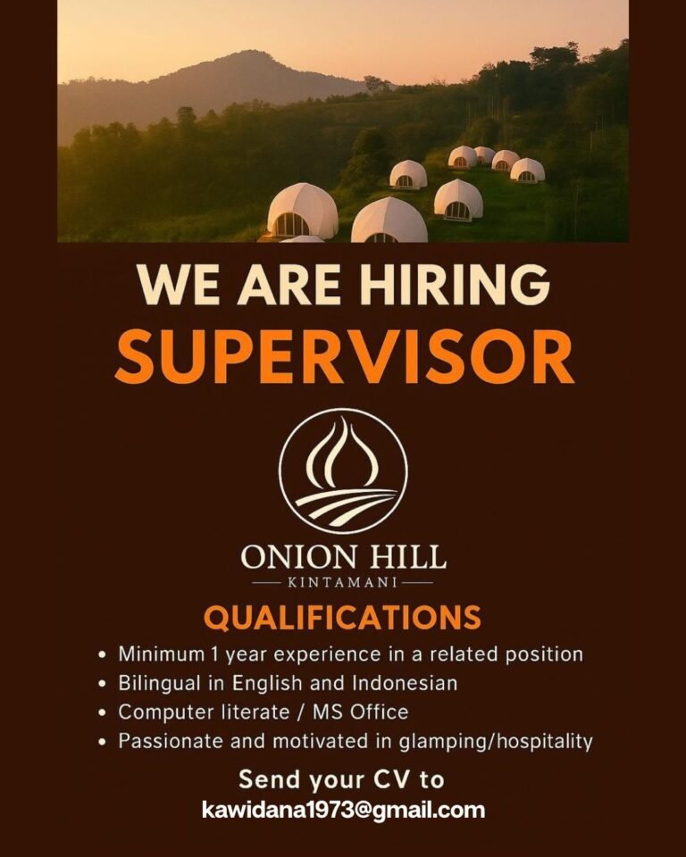 LOKER.BALINEWS.ID, BANGLI – Onion Hill Kintamani membuka kesempatan bagi kandidat berpengalaman untuk bergabung sebagai Supervisor. Posisi ini cocok bagi kamu yang menyukai dunia hospitality, memiliki jiwa kepemimpinan, dan siap terlibat langsung dalam operasional glamping resort yang terus berkembang.