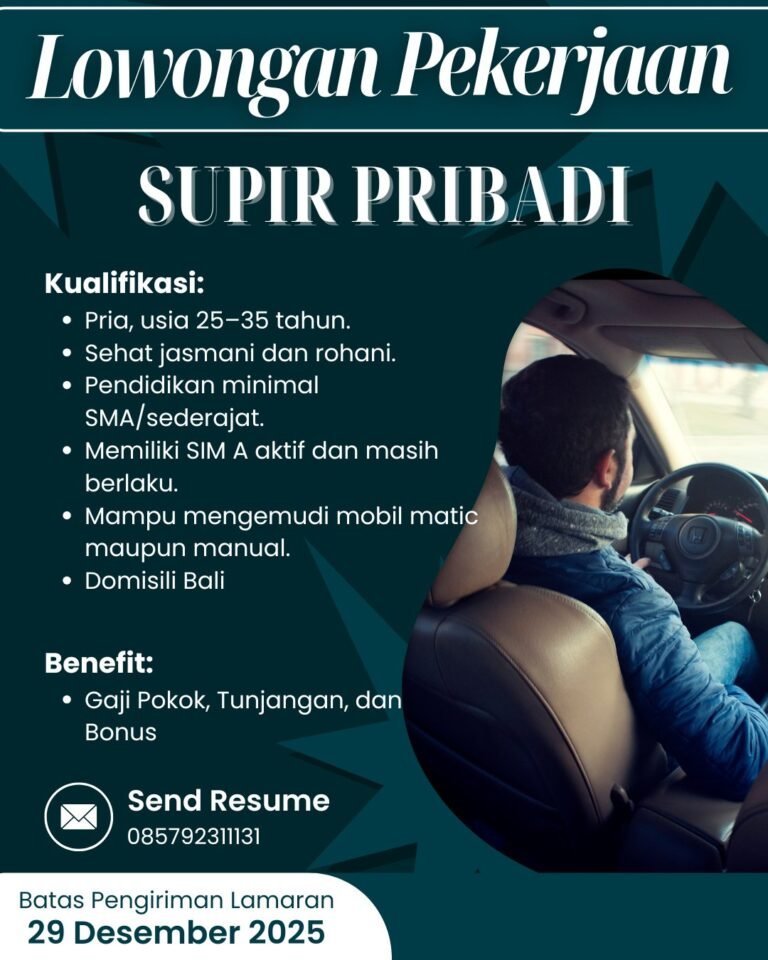 LOKER.BALINEWS.ID, BALI — Telah dibuka Lowongan Kerja Bali Supir Pribadi bagi kandidat berpengalaman yang siap bertugas mendukung mobilitas harian pengguna jasa. Posisi ini diperuntukkan bagi pelamar pria berusia 25–35 tahun, sehat jasmani dan rohani, dengan pendidikan minimal SMA/sederajat.