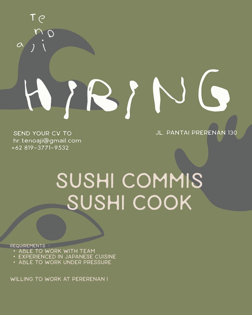 Bagi Anda yang tertarik melamar lowongan kerja Bali posisi Sushi Commis dan Sushi Cook, silakan mengirimkan CV dan surat lamaran melalui email hr.tenoaji@gmail.com atau menghubungi WhatsApp +62 819 3771 9532.