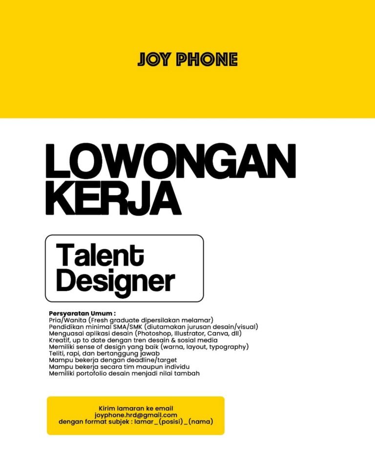 Selain kemampuan teknis, calon pelamar diharapkan mampu bekerja sesuai target deadline dan memiliki portofolio desain yang menarik. Segera kirimkan lamaran dan portofolio terbaik Anda ke email joyphone.hrd@gmail.com dengan format subjek: lamar_Talent Designer_(nama).