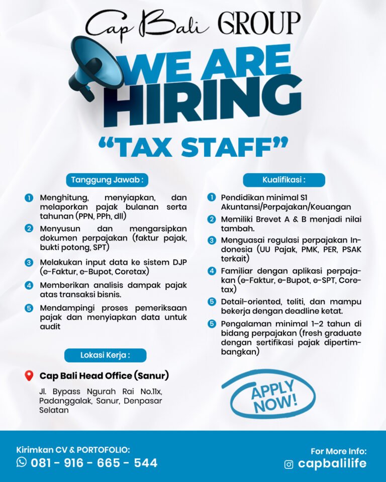 LOKER.BALINEWS.ID, DENPASAR – Cap Bali Group, sebuah perusahaan yang bergerak di bidang industri fesyen dan mode dengan motif kultur etnis Bali, saat ini sedang membuka kesempatan karier untuk posisi Tax Staff. Posisi ini memiliki peran krusial dalam mengelola aspek perpajakan perusahaan, mulai dari menghitung, menyiapkan, hingga melaporkan pajak bulanan dan tahunan seperti PPN, PPh, dan jenis pajak lainnya. Selain itu, kandidat terpilih akan bertanggung jawab menyusun dokumen perpajakan, melakukan input data ke sistem DJP (e-Faktur, e-Bupot, Coretax), serta mendampingi proses pemeriksaan pajak untuk kebutuhan audit.