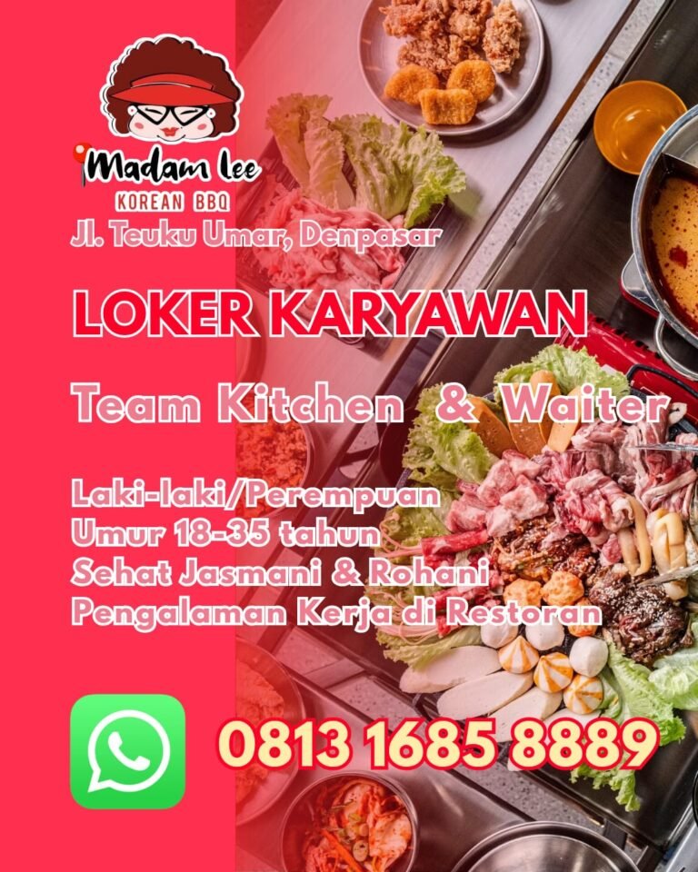 Melalui Lowongan Kerja Bali Team Kitchen dan Waiter Madam Lee Korean BBQ Denpasar ini, perusahaan membuka kesempatan bagi pria maupun wanita berusia 18–35 tahun, sehat jasmani dan rohani, serta memiliki pengalaman kerja di restoran. Kandidat yang terpilih diharapkan mampu bekerja secara tim, memiliki etos kerja yang baik, dan siap memberikan pelayanan terbaik kepada pelanggan. Bagi pelamar yang berminat, silakan mengirimkan lamaran atau menghubungi pihak manajemen melalui WhatsApp di nomor 0813 1685 8889 untuk informasi dan proses rekrutmen lebih lanjut.