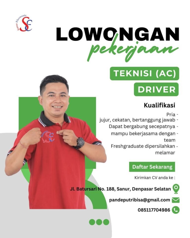 Loker.BaliNews.id, Denpasar – Sanur Electronic, sebuah usaha jasa perbaikan dan layanan elektronik yang berlokasi di Sanur, Denpasar Selatan, sedang membuka lowongan untuk dua posisi yaitu Teknisi AC dan Driver. Perusahaan mencari kandidat pria yang jujur, cekatan, bertanggung jawab, serta mampu bekerja sama dalam tim. Pelamar yang dapat bergabung segera akan diutamakan, dan fresh graduate juga dipersilakan melamar.