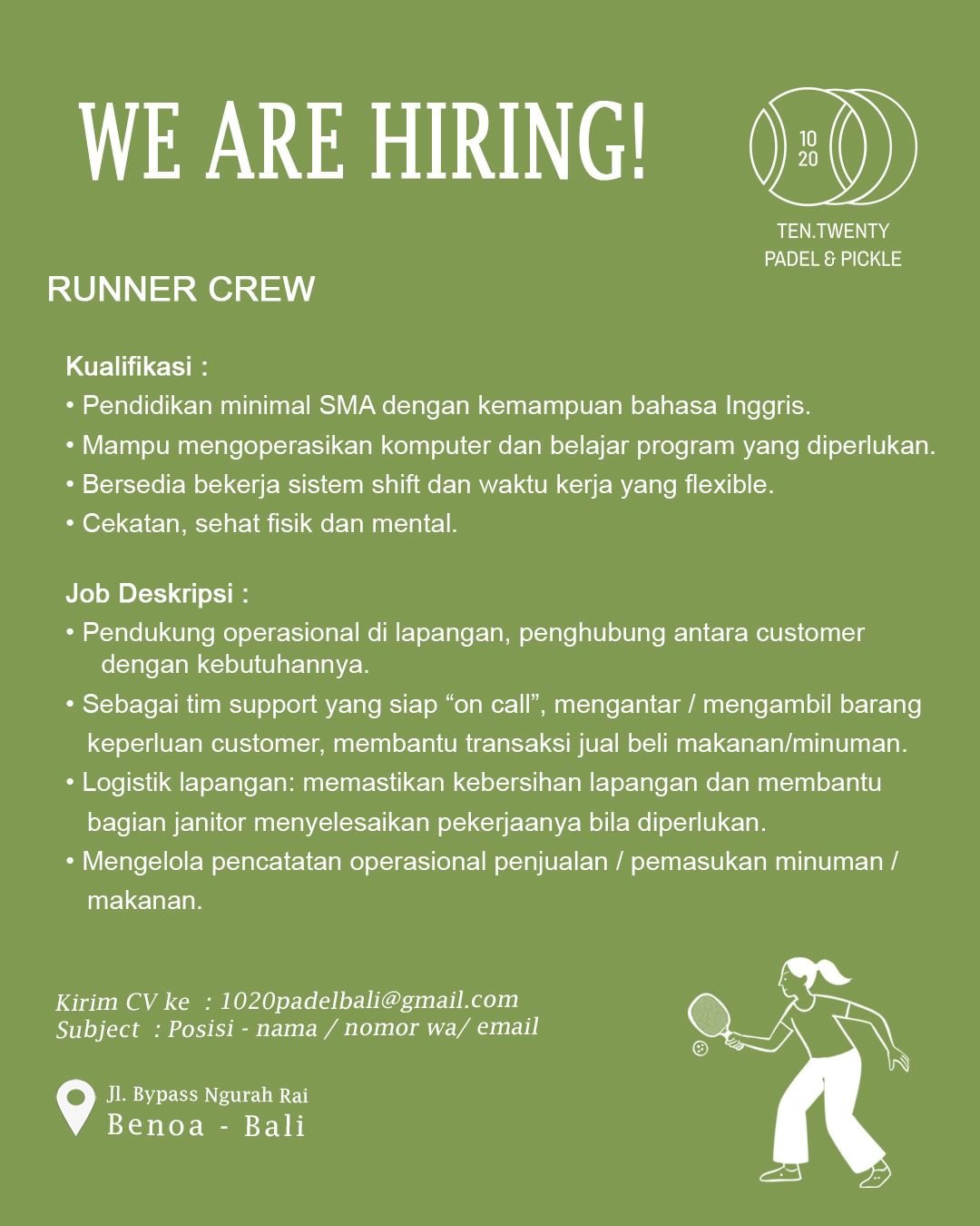 Selain aspek pelayanan, Runner Crew juga bertanggung jawab pada logistik lapangan, termasuk memastikan kebersihan area dan membantu tim janitor jika diperlukan. Bagi Anda yang memenuhi kriteria dan ingin berkembang di industri sport & leisure, segera kirimkan CV ke email 1020padelbali@gmail.com dengan format subjek: Posisi – nama / nomor wa/ email. Bergabunglah bersama tim Ten.Twenty Padel & Pickle Bali untuk pengalaman kerja yang seru dan menantang.