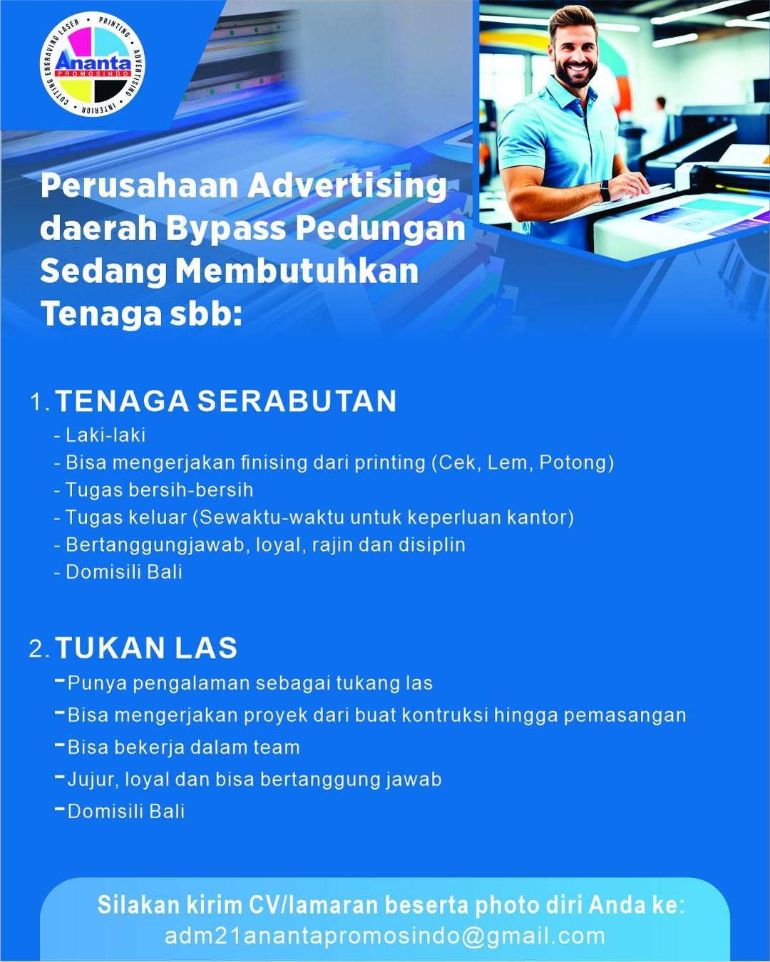 LOKER.BALINEWS.ID, DENPASAR — Lowongan Kerja Bali Tenaga Serabutan kembali dibuka oleh sebuah perusahaan advertising yang berlokasi di kawasan Bypass Pedungan. Perusahaan ini membutuhkan kandidat yang siap bekerja membantu proses finishing printing, mulai dari pengecekan, pemotongan, hingga kegiatan kebersihan serta tugas luar kantor jika diperlukan. Pelamar diutamakan laki-laki, berdomisili di Bali, serta memiliki sikap bertanggung jawab, disiplin, dan rajin.