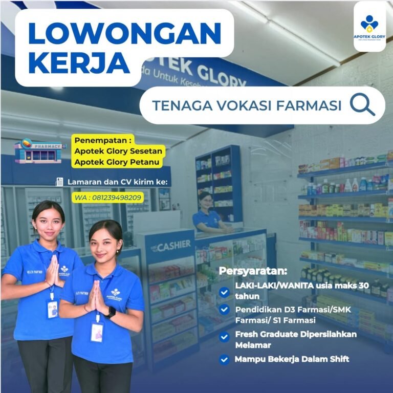 LOKER.BALINEWS.ID, DENPASAR – Apotek Glory, salah satu jaringan penyedia layanan kefarmasian di Bali, saat ini sedang membuka kesempatan karir bagi para profesional muda kesehatan untuk bergabung sebagai Tenaga Vokasi Farmasi. Lowongan ini dibuka untuk mengisi posisi di dua lokasi strategis di wilayah Denpasar, yaitu penempatan di Apotek Glory Sesetan dan Apotek Glory Petanu. Sebagai bagian dari tim kesehatan, kandidat terpilih nantinya akan bertanggung jawab dalam memberikan pelayanan kefarmasian yang prima kepada masyarakat.