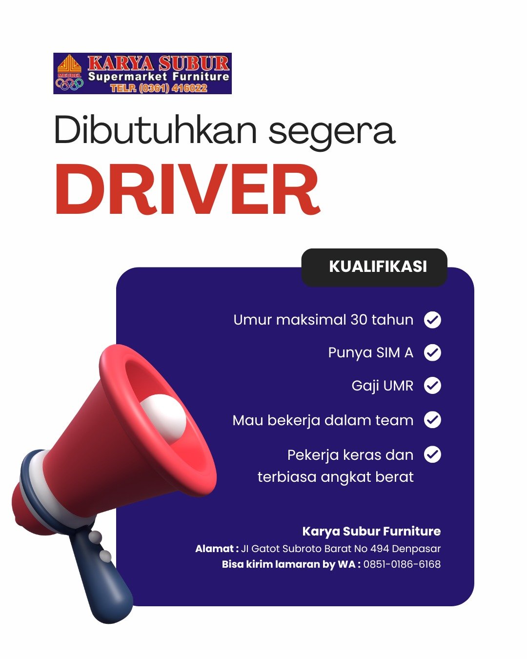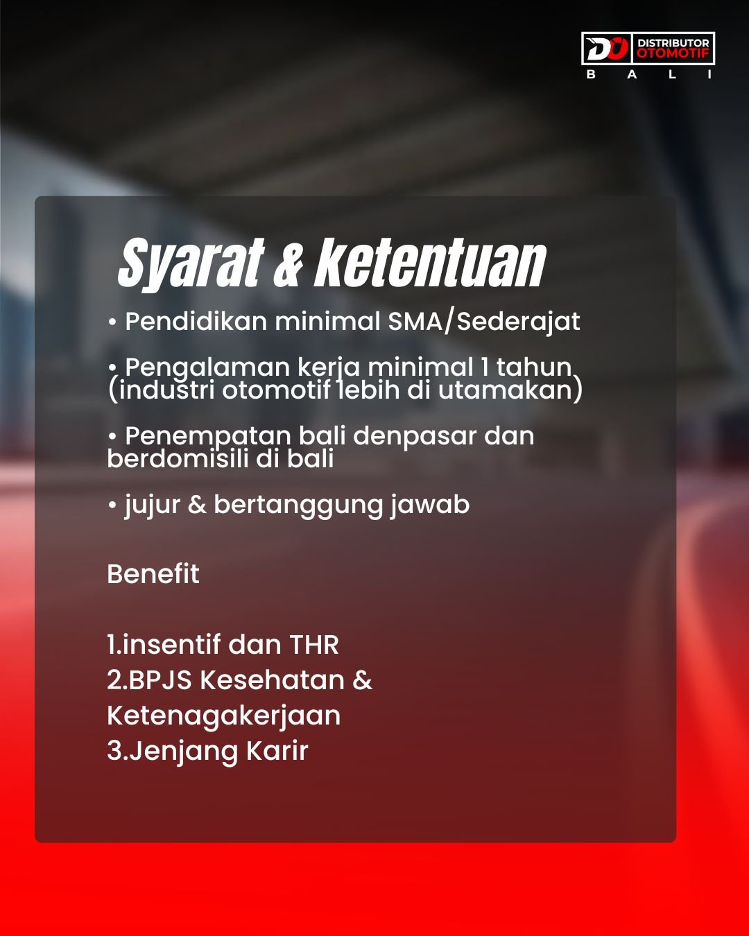 LOKER.BALINEWS.ID, KOTA DENPASAR – Distributor Otomotif Bali saat ini membuka kesempatan bergabung untuk Anda yang ingin berkembang bersama perusahaan otomotif yang terus bertumbuh. Dibutuhkan segera beberapa posisi dengan penempatan di Denpasar, Bali.