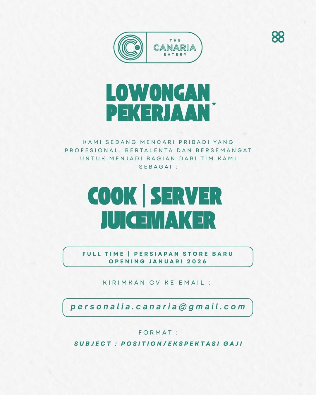 LOKER.BALINEWS.ID, — The Canaria Eatery membuka lowongan untuk posisi Cook, Server, dan Juicemaker (Full Time), dalam rangka persiapan pembukaan store baru pada Januari 2026.