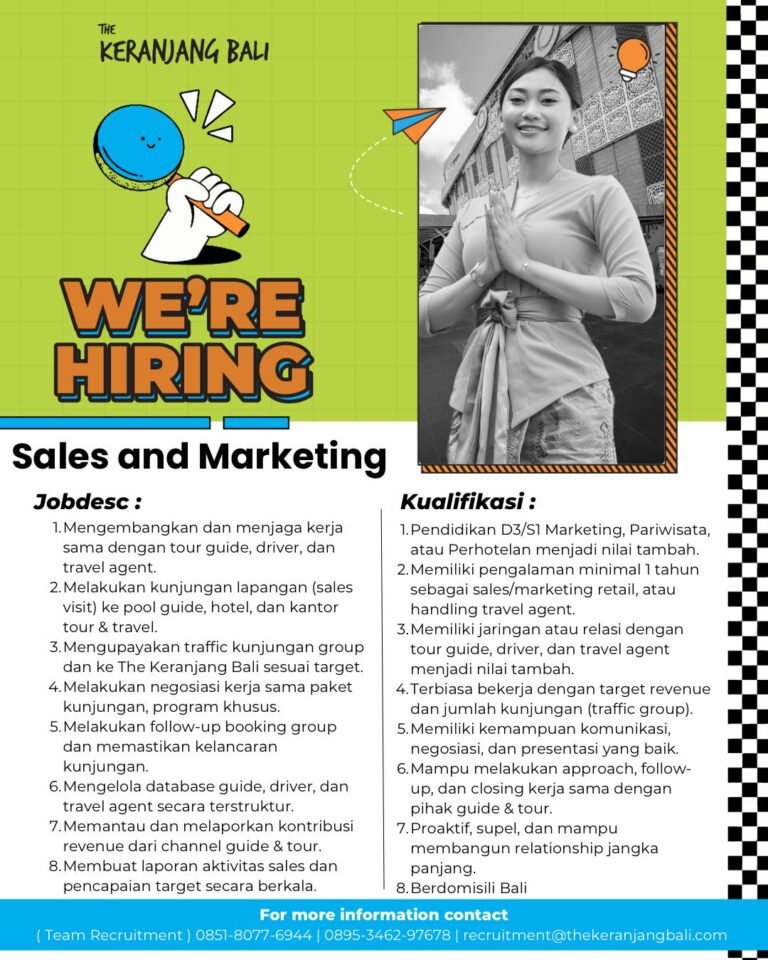 Melalui rekrutmen Lowongan Kerja Bali The Keranjang Bali ini, perusahaan mencari pelamar yang memiliki kemampuan membangun relasi, mengelola konten digital, menyusun strategi kampanye, hingga menangani koordinasi administrasi dan komunikasi manajemen. Pengalaman di bidang marketing, kemampuan presentasi, penguasaan social media, serta keterampilan koordinasi lintas divisi menjadi nilai tambah penting. Dengan budaya kerja yang dinamis dan peluang pengembangan karier, lowongan ini menjadi kesempatan menarik bagi talenta muda di Bali yang ingin berkembang di industri pariwisata dan ritel modern. Kandidat yang memenuhi kualifikasi disarankan menghubungi tim rekrutmen resmi untuk mengikuti tahapan seleksi lebih lanjut.
