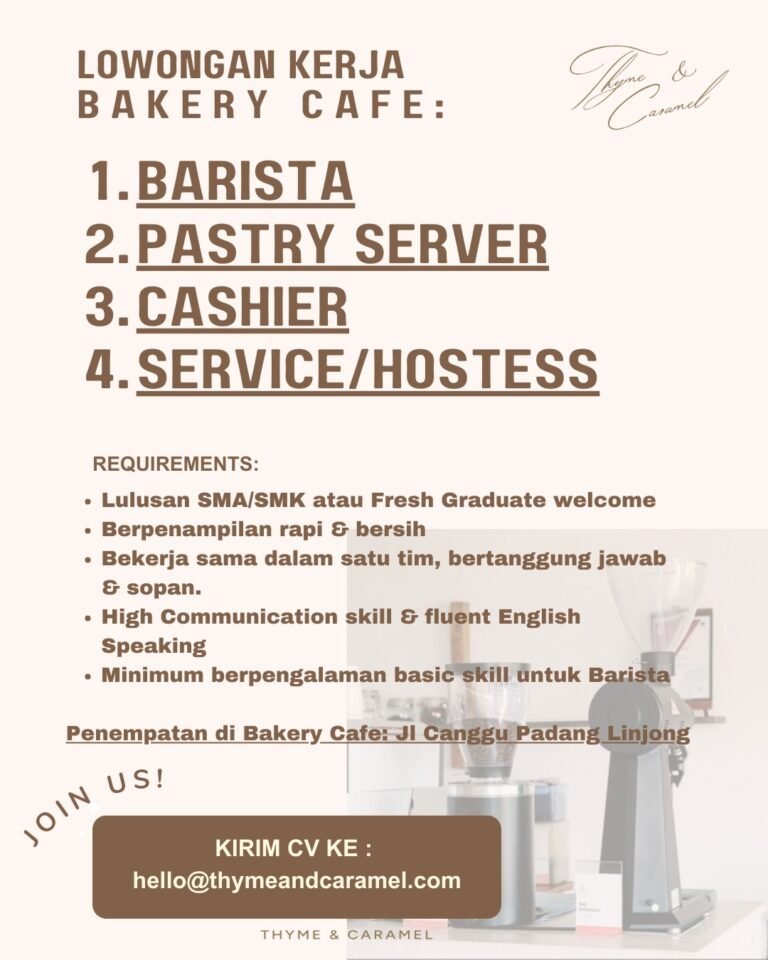 LOKER.BALINEWS.ID, BADUNG – Thyme & Caramel, sebuah Bakery Cafe yang terletak di kawasan populer Canggu, saat ini sedang membuka kesempatan karir bagi individu yang dinamis untuk bergabung dalam tim mereka. Lowongan ini mencakup berbagai posisi kunci, yaitu Barista, Pastry Server, Cashier, dan Service/Hostess. Penempatan kerja akan difokuskan di cabang Bakery Cafe mereka yang beralamat di Jalan Canggu Padang Linjong.