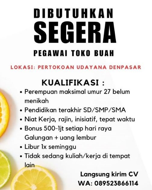 LOKER.BALINEWS.ID, DENPASAR – Sebuah unit usaha dagang yang berlokasi di kawasan Pertokoan Udayana, Denpasar, saat ini sedang membuka kesempatan kerja bagi tenaga kerja lokal untuk mengisi posisi sebagai Pegawai Toko Buah. Lowongan ini dikhususkan bagi perempuan dengan usia maksimal 27 tahun dan berstatus belum menikah. Pihak pengelola toko menekankan bahwa mereka mencari kandidat yang memiliki niat kerja tinggi, rajin, inisiatif, serta disiplin dalam hal waktu, dengan latar belakang pendidikan terakhir minimal SD, SMP, atau SMA.