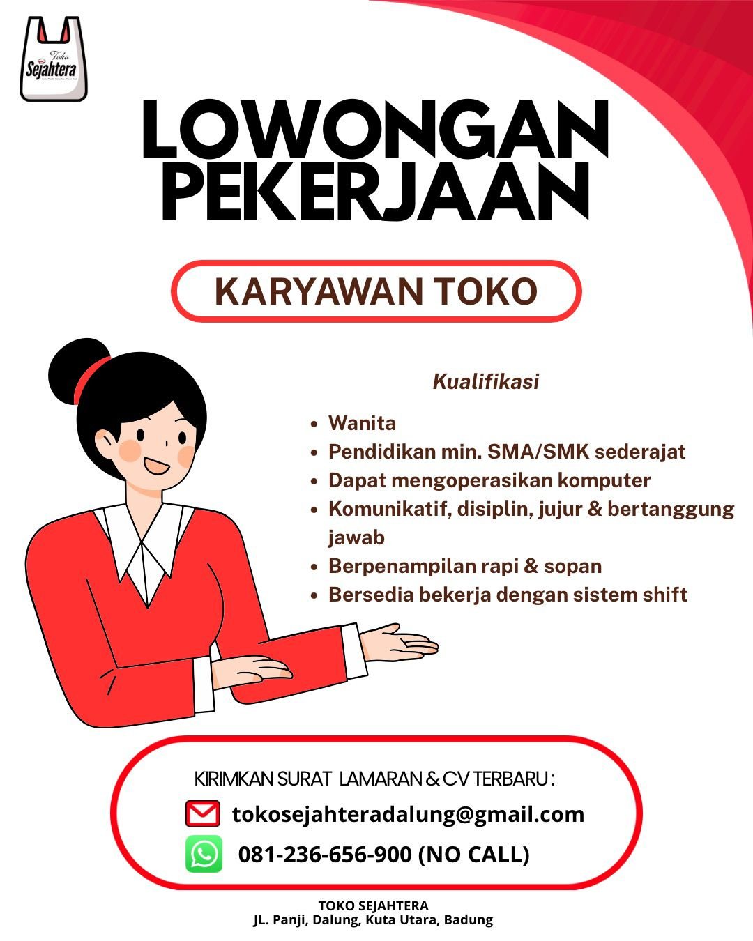 Bagi Anda yang memenuhi kualifikasi tersebut, segera kirimkan Surat Lamaran dan CV terbaru Anda ke alamat email tokosejahteradalung@gmail.com. Anda juga dapat mengirimkan berkas melalui WhatsApp ke nomor 081-236-656-900 dengan catatan hanya menerima pesan teks (no call). Lokasi fisik toko berada di Jl. Panji, Dalung, Kuta Utara, Badung. Segera ajukan lamaran Anda sebelum posisi ini terisi.
