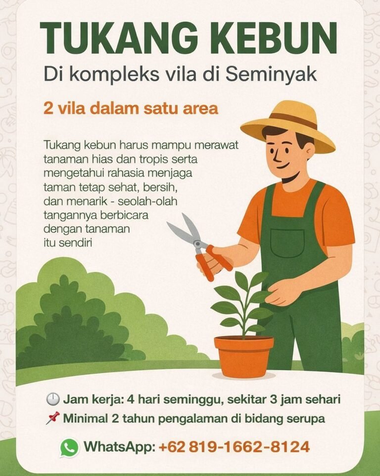 LOKER.BALINEWS.ID, BADUNG – Sebuah akomodasi villa yang berlokasi di kawasan wisata Seminyak saat ini sedang membutuhkan tenaga kerja segera untuk mengisi posisi Tukang Kebun (Gardener). Peran ini sangat penting dalam menjaga keasrian dan estetika area hijau villa guna memberikan kenyamanan maksimal bagi para tamu yang menginap. Penempatan kerja akan difokuskan pada pemeliharaan rutin tanaman dan area luar ruangan di properti tersebut.
