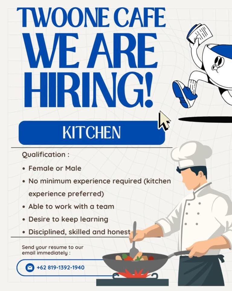 LOKER.BALINEWS.ID, BALI – Twoone Cafe, salah satu unit usaha kuliner di Bali, saat ini sedang membuka kesempatan berkarir bagi individu yang bersemangat untuk mengisi posisi di bagian Kitchen. Lowongan ini terbuka bagi pria maupun wanita yang memiliki disiplin tinggi, jujur, serta memiliki keterampilan yang memadai di dapur. Pihak kafe menekankan bahwa mereka mencari kandidat yang memiliki keinginan kuat untuk terus belajar dan mampu bekerja sama secara efektif di dalam tim.