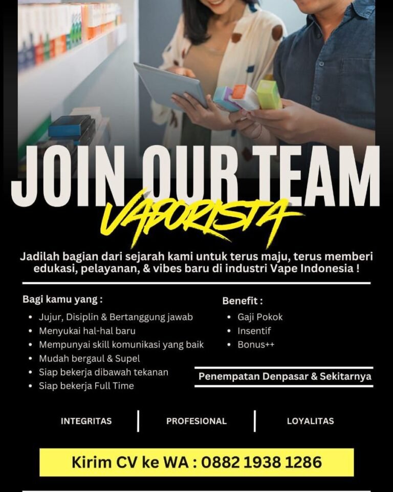 LOKER.BALINEWS.ID, DENPASAR — Sebuah store vape membuka lowongan kerja untuk posisi Vaporista dengan penempatan di Denpasar dan sekitarnya. Perusahaan mencari kandidat yang jujur, disiplin, bertanggung jawab, serta memiliki kemampuan komunikasi yang baik. Pelamar diharapkan mudah bergaul, siap bekerja di bawah tekanan, dan bersedia bekerja full time. Posisi ini cocok bagi kandidat yang menyukai hal-hal baru dan ingin ikut berkembang bersama industri vape di Indonesia.