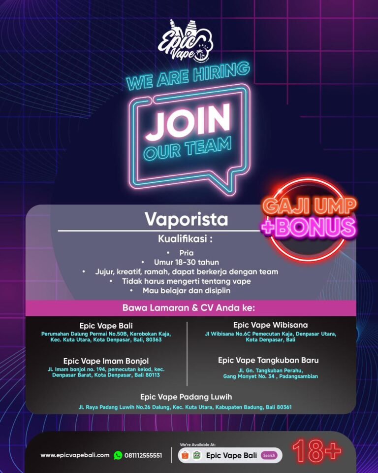 Bagi yang berminat, segera ajukan lamaran sebelum posisi terpenuhi. Informasi lebih lanjut dapat dilihat melalui akun resmi Epic Vape Bali atau menghubungi kontak yang tertera.