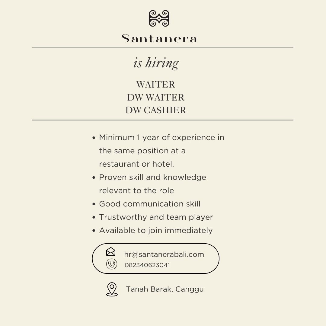 LOKER.BALINEWS.ID, BADUNG — Santanera yang berlokasi di Tanah Barak, Canggu, membuka kesempatan bagi kandidat berpengalaman untuk bergabung sebagai Waiter, DW Waiter, dan DW Cashier. Restoran ini mencari talenta yang memiliki pengalaman kerja minimal satu tahun di posisi serupa di restoran atau hotel, serta mampu bekerja dalam tim dengan attitude profesional.