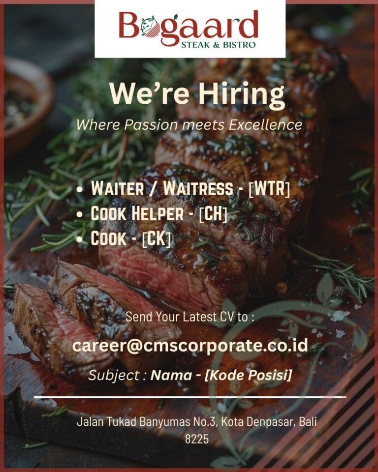 LOKER.BALINEWS.ID, DENPASAR – Bogaard Steak & Bistro, sebuah destinasi kuliner yang mengusung konsep keunggulan dalam cita rasa, saat ini tengah membuka peluang karir bagi para profesional di bidang Food & Beverage. Restoran yang berlokasi di Jalan Tukad Banyumas No. 3, Kota Denpasar ini sedang mencari individu-individu yang memiliki gairah tinggi untuk bergabung dalam tim operasional mereka. Posisi yang tersedia saat ini meliputi Waiter atau Waitress dengan kode posisi [WTR], Cook Helper dengan kode posisi [CH], serta Cook dengan kode posisi [CK].