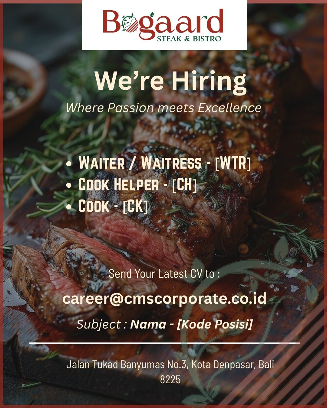 Manajemen Bogaard Steak & Bistro mencari kandidat yang siap memberikan pelayanan terbaik dan berkontribusi dalam menjaga standar kualitas masakan yang disajikan. Bagi Anda yang ingin mengembangkan keahlian memasak maupun pelayanan pelanggan di lingkungan kerja yang profesional, segera kirimkan Curriculum Vitae (CV) terbaru Anda. Berkas lamaran dapat dikirimkan melalui alamat email resmi perusahaan di career@cmscorporate.co.id dengan menuliskan subjek email menggunakan format: Nama – [Kode Posisi].