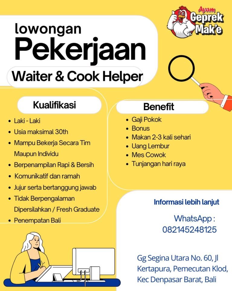 Lowongan Kerja Bali Waiter dan Cook Helper di Ayam Geprek Mak’e Denpasar
