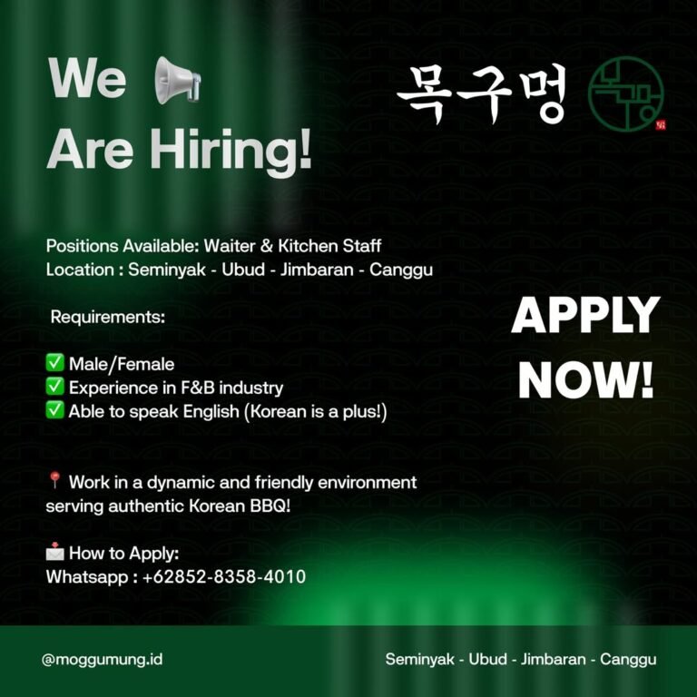 LOKER.BALINEWS.ID, BALI – Moggumung.id, sebuah restoran yang menyajikan hidangan autentik Korean BBQ, sedang membuka kesempatan berkarir bagi tenaga profesional untuk posisi Waiter dan Kitchen Staff. Lowongan ini dibuka untuk penempatan di beberapa area strategis di Bali, meliputi kawasan Seminyak, Ubud, Jimbaran, dan Canggu. Kesempatan ini sangat terbuka bagi pria maupun wanita yang ingin bekerja di lingkungan yang dinamis dan bersahabat.