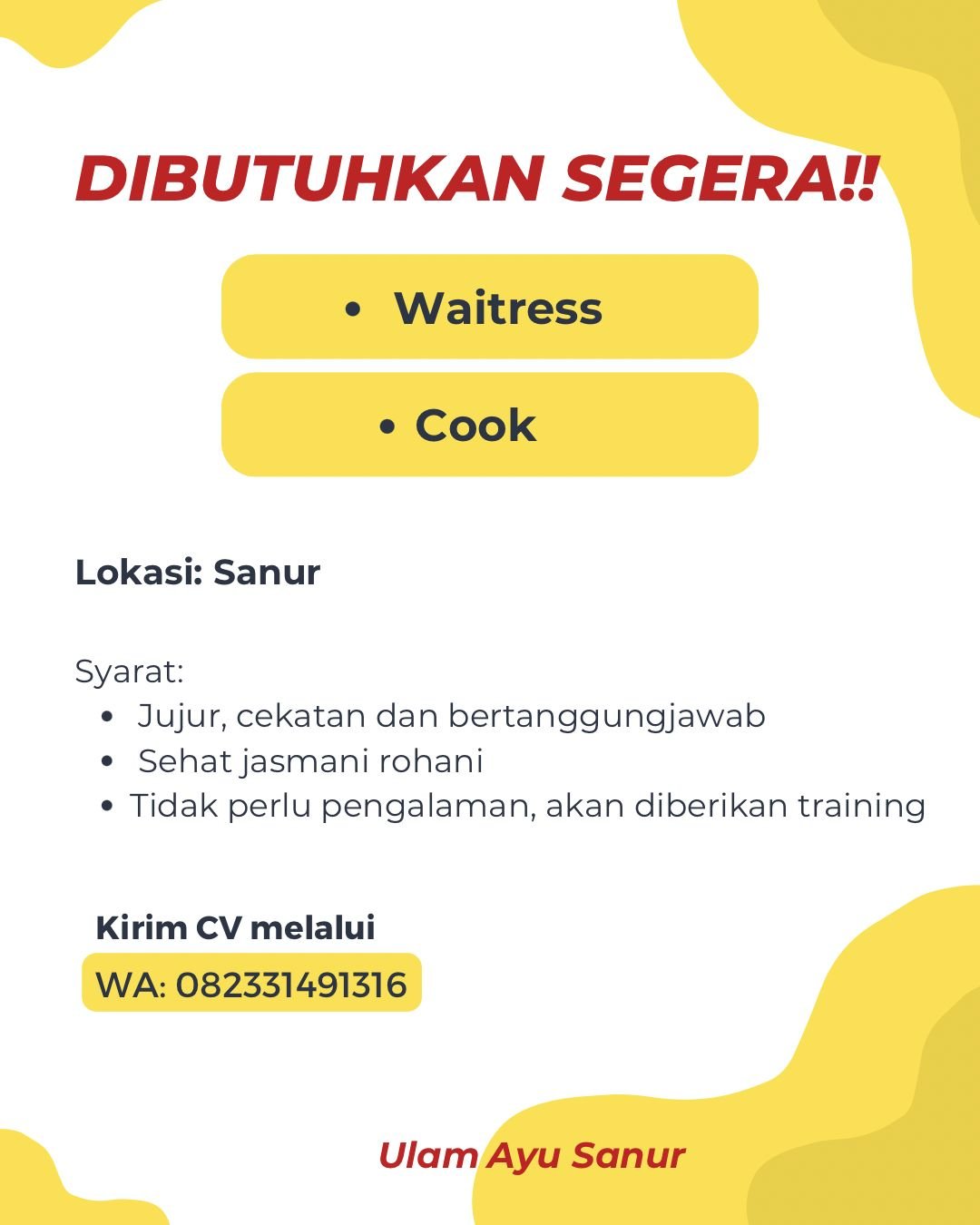 LOKER.BALINEWS.ID, DENPASAR – Ulam Ayu Sanur membuka lowongan pekerjaan dibutuhkan segera untuk posisi Waitress dan Cook. Penempatan kerja berlokasi di Sanur, Denpasar, Bali.