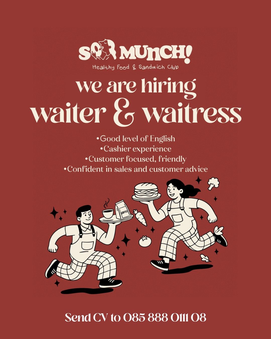 LOKER.BALINEWS.ID, DENPASAR — So Munch Healthy Food & Sandwich Club membuka lowongan untuk posisi Waiter & Waitress. Kandidat diharapkan memiliki kemampuan bahasa Inggris yang baik, berpengalaman sebagai kasir, ramah, fokus pada pelayanan pelanggan, serta percaya diri dalam penjualan dan pemberian saran kepada customer. Kirimkan CV Anda ke nomor yang tertera pada poster.