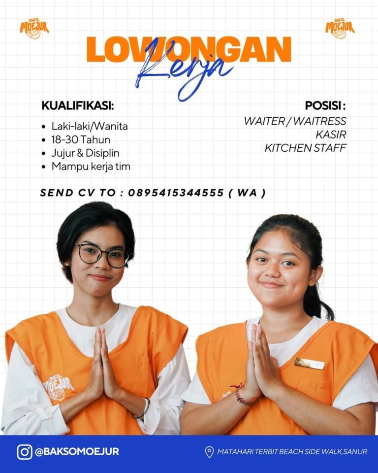 LOKER.BALINEWS.ID, DENPASAR — Bakso Moejur yang berlokasi strategis di Matahari Terbit Beach Side Walk, Sanur, saat ini tengah membuka kesempatan kerja bagi tenaga kerja produktif untuk bergabung dalam tim operasional mereka. Posisi yang tersedia meliputi Waiter/Waitress, Kasir, dan Kitchen Staff. Perusahaan mencari kandidat laki-laki maupun wanita dengan rentang usia 18 hingga 30 tahun yang siap bekerja dalam lingkungan yang dinamis.