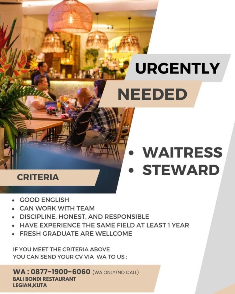 LOKER.BALINEWS.ID, BADUNG – Bali Bondi Restaurant yang berlokasi di kawasan Legian, Kuta, saat ini sedang membuka lowongan pekerjaan darurat (urgently needed) untuk posisi Waitress dan Steward. Kesempatan ini terbuka bagi individu yang ingin berkarir di industri kuliner yang dinamis dengan fokus pada pelayanan pelanggan yang berkualitas.
