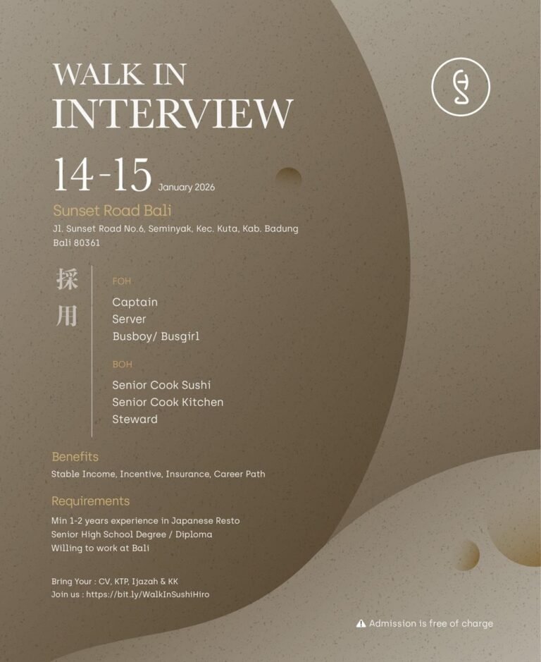 Kualifikasi yang ditetapkan oleh manajemen Sushi Hiro meliputi latar belakang pendidikan minimal lulusan SMA atau Diploma serta memiliki pengalaman kerja selama 1-2 tahun di restoran Jepang. Selain itu, kandidat harus bersedia ditempatkan dan bekerja di Bali. Bagi Anda yang tertarik, proses wawancara langsung akan dilaksanakan pada tanggal 14-15 Januari 2026 berlokasi di Jl. Sunset Road No.6, Seminyak, Kec. Kuta, Kab. Badung. Pelamar diwajibkan membawa dokumen fisik berupa CV, KTP, Ijazah, dan Kartu Keluarga (KK), serta mendaftarkan diri melalui tautan resmi yang telah disediakan.