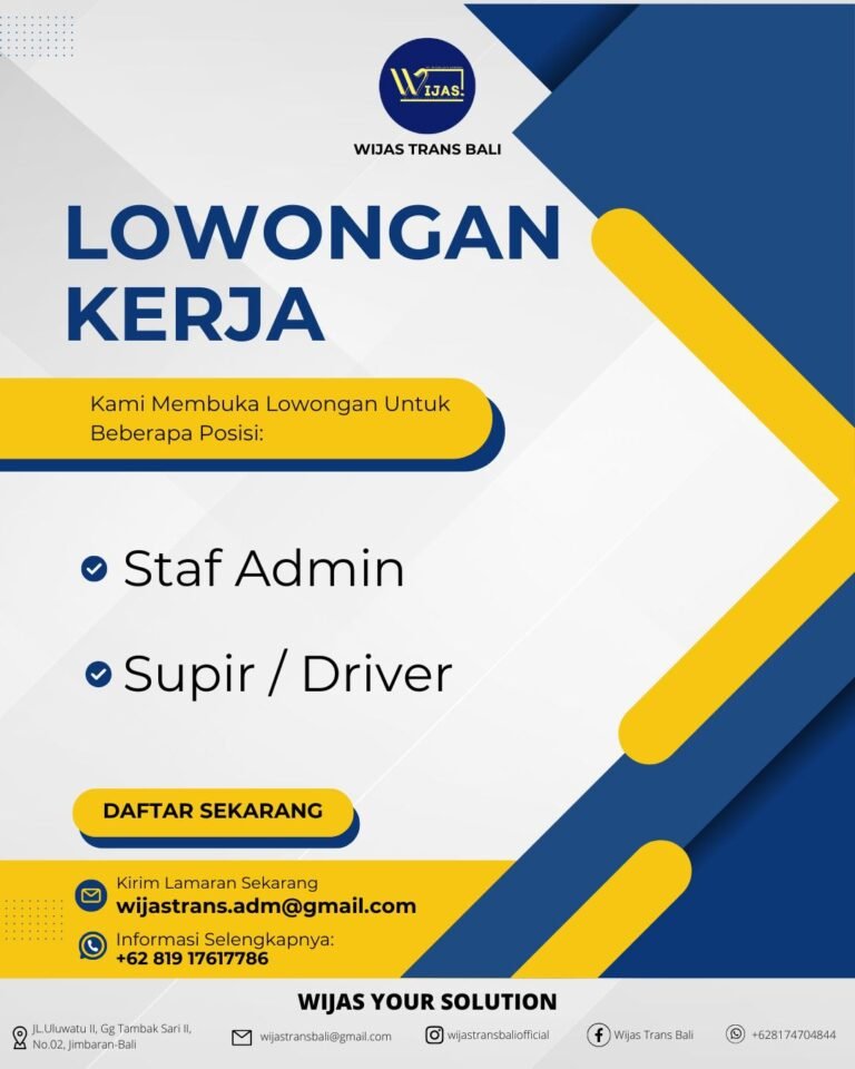 LOKER.BALINEWS.ID, BADUNG – Wijas Trans Bali, sebuah penyedia solusi transportasi yang berlokasi di Jalan Uluwatu II, Gang Tambak Sari II, No. 02, Jimbaran, saat ini tengah membuka kesempatan berkarir bagi tenaga kerja profesional. Perusahaan sedang mencari kandidat yang kompeten untuk mengisi dua posisi penting, yakni Staf Admin dan Supir/Driver guna mendukung kelancaran operasional layanan mereka di wilayah Bali.