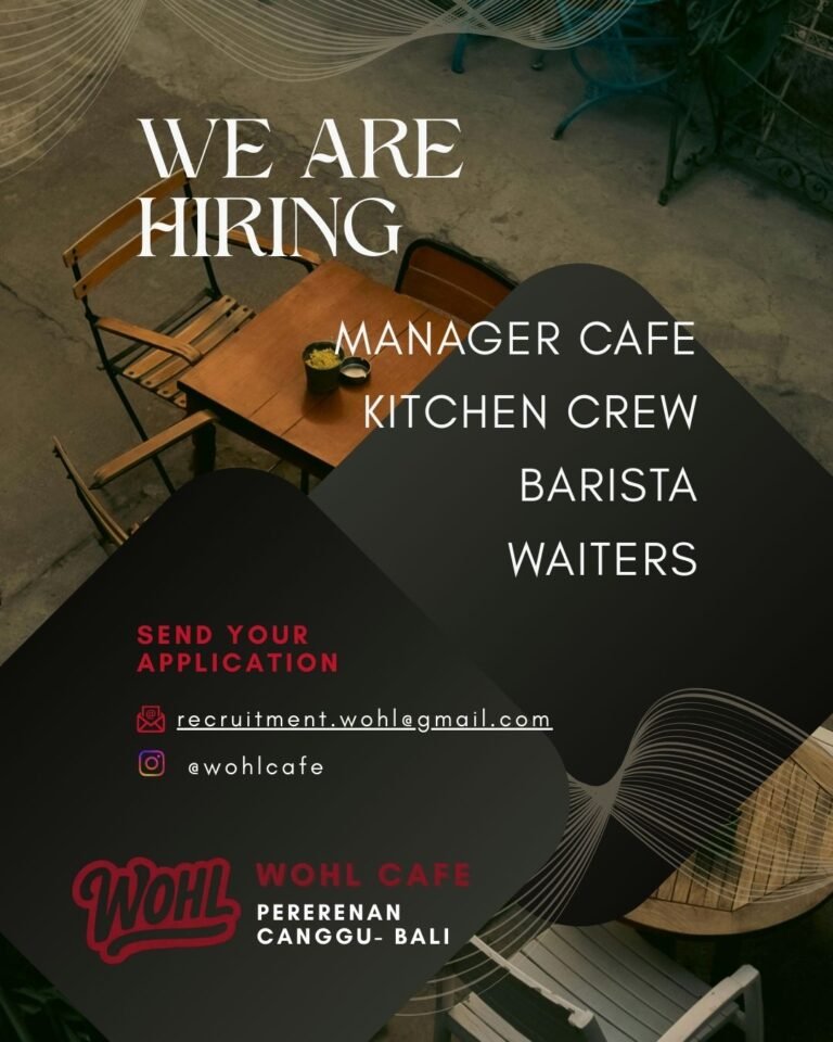 LOKER.BALINEWS.ID, BADUNG – Wohl Cafe, salah satu destinasi kuliner yang berlokasi di kawasan populer Pererenan, Canggu, saat ini tengah membuka kesempatan berkarir bagi para profesional muda di bidang Food and Beverage (F&B). Kafe ini sedang mencari kandidat berbakat untuk memperkuat tim operasional mereka guna memberikan pelayanan terbaik bagi pelanggan di kawasan Badung. Adapun posisi strategis yang ditawarkan meliputi Manager Cafe, Kitchen Crew, Barista, serta Waiters.