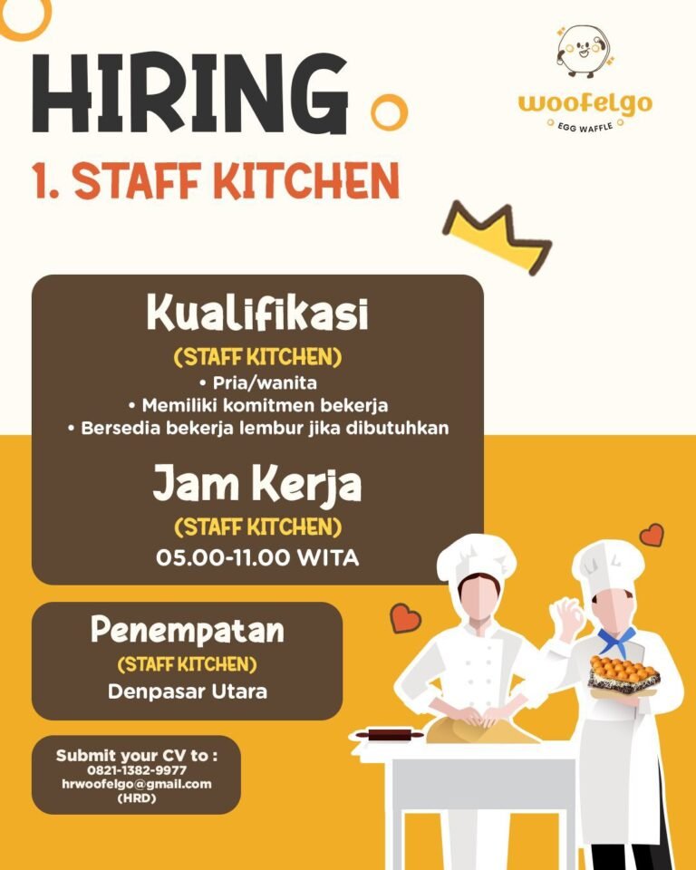 LOKER.BALINEWS.ID – Woofelago Egg Waffle membuka lowongan kerja terbaru di Bali untuk posisi Staff Kitchen dengan penempatan di Denpasar Utara. Kesempatan ini terbuka bagi pria maupun wanita yang memiliki komitmen kerja tinggi dan siap bekerja di lingkungan dapur yang dinamis.