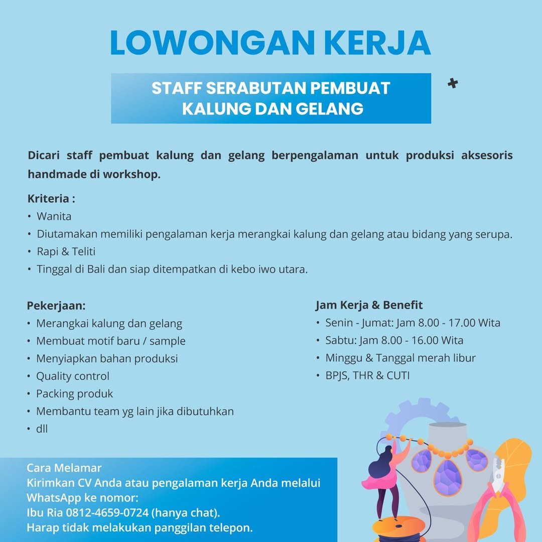 Bagi Anda yang berminat dan saat ini tinggal di Bali, silakan mengirimkan CV atau ringkasan pengalaman kerja melalui pesan WhatsApp ke nomor 0812-4659-0724 atas nama Ibu Ria. Harap diperhatikan bahwa pelamar diminta hanya mengirimkan pesan teks (chat) dan dilarang melakukan panggilan telepon. Segera kirimkan lamaran Anda dan bergabunglah bersama tim kreatif dalam memproduksi aksesoris handmade yang berkualitas.