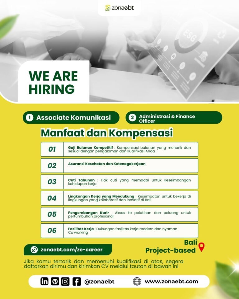 Kandidat yang terpilih akan mendapatkan berbagai manfaat dan kompensasi menarik, termasuk gaji bulanan kompetitif yang disesuaikan dengan pengalaman serta kualifikasi. Selain itu, ZonaEBT menyediakan fasilitas asuransi kesehatan, asuransi ketenagakerjaan, hak cuti tahunan, serta akses ke pelatihan untuk pengembangan karir profesional. Lingkungan kerja yang didukung oleh fasilitas co-working modern di Bali juga menjadi salah satu nilai tambah bagi para pelamar. Bagi Anda yang memenuhi kualifikasi, pendaftaran dan pengiriman CV dapat dilakukan melalui tautan resmi di zonaebt.com/ze-career.