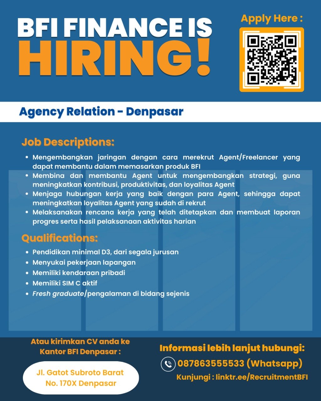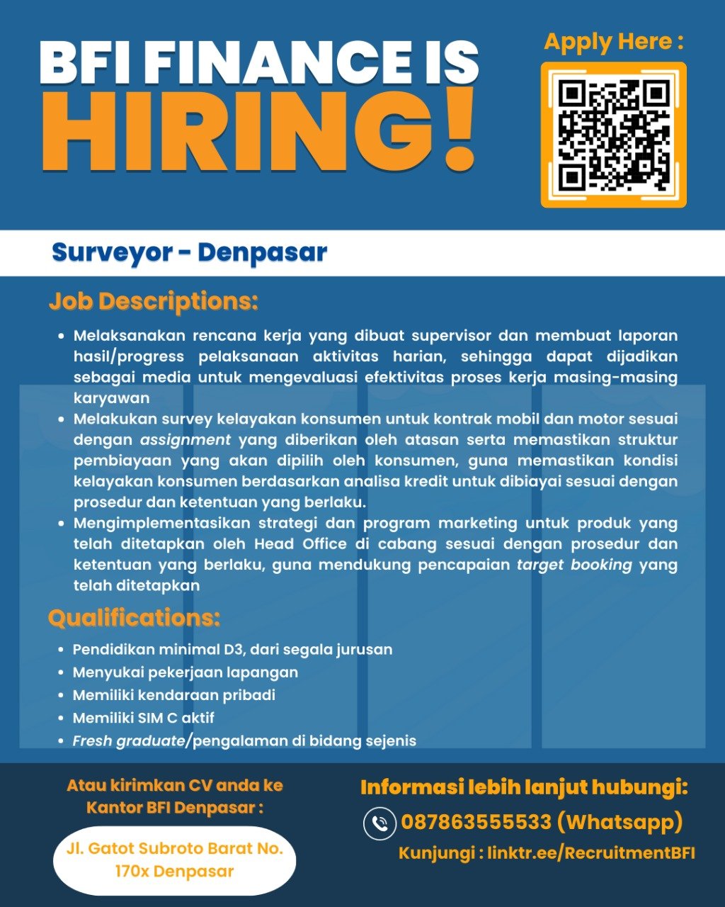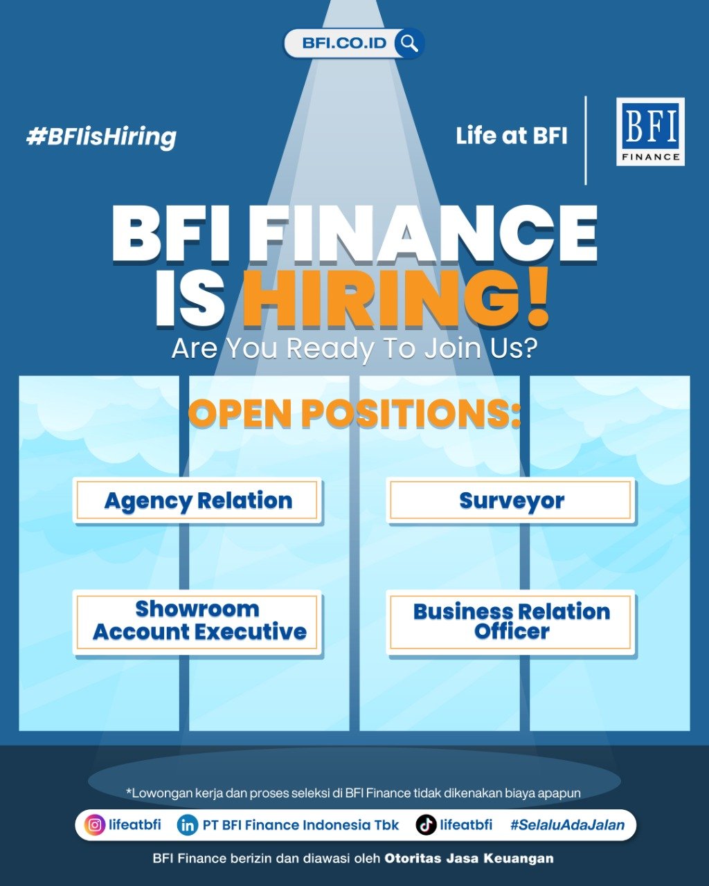 Non-Biaya: Lowongan kerja dan proses seleksi di BFI Finance tidak dikenakan biaya apa pun (Lowongan kerja dan proses seleksi di BFI Finance tidak dikenakan biaya apapun).