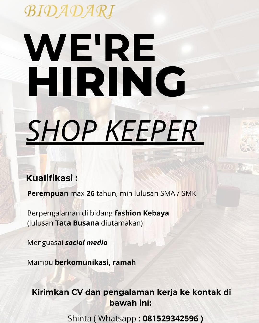 Bidadari Boutique, sebuah butik yang dikenal dengan koleksi kebaya dan busana tradisional modern, resmi membuka lowongan untuk posisi Shop Keeper. Rekrutmen ini ditujukan bagi kandidat perempuan yang memiliki ketertarikan kuat di dunia fashion, khususnya kebaya, serta mampu memberikan pelayanan ramah kepada pelanggan.