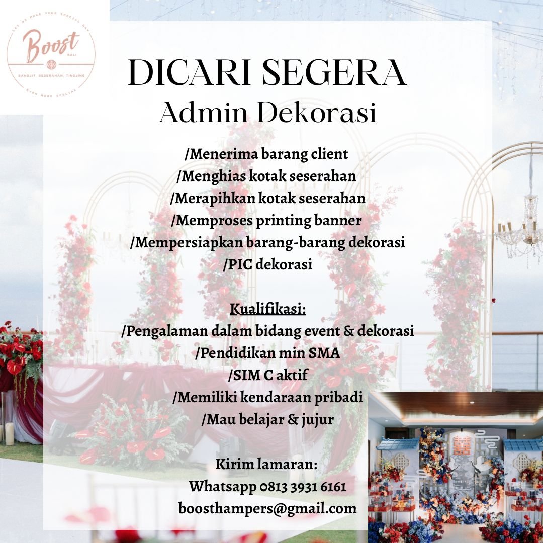 Melalui rekrutmen ini, Boost Hampers Bali berharap dapat menemukan individu yang kreatif, bertanggung jawab, dan siap mendukung kualitas layanan dekorasi serta kebutuhan event perusahaan.