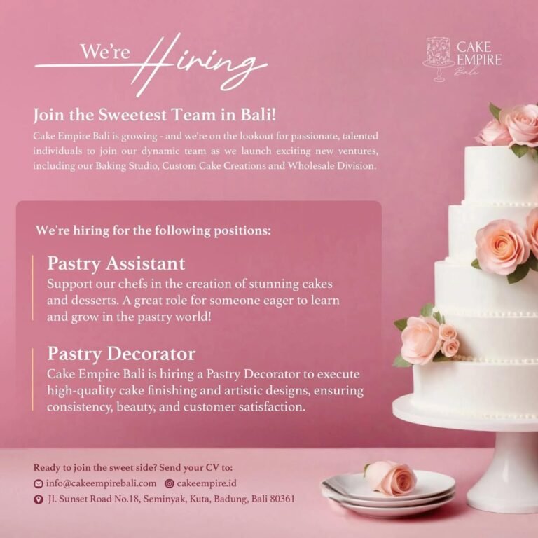 Cake Empire Bali, salah satu brand pastry dan custom cake yang tengah berkembang pesat di Pulau Dewata, resmi mengumumkan pembukaan lowongan kerja untuk dua posisi sekaligus, yaitu Pastry Assistant dan Pastry Decorator. Rekrutmen ini dibuka sebagai bagian dari ekspansi usaha mereka yang meliputi Baking Studio, Custom Cake Creations, hingga divisi Wholesale.