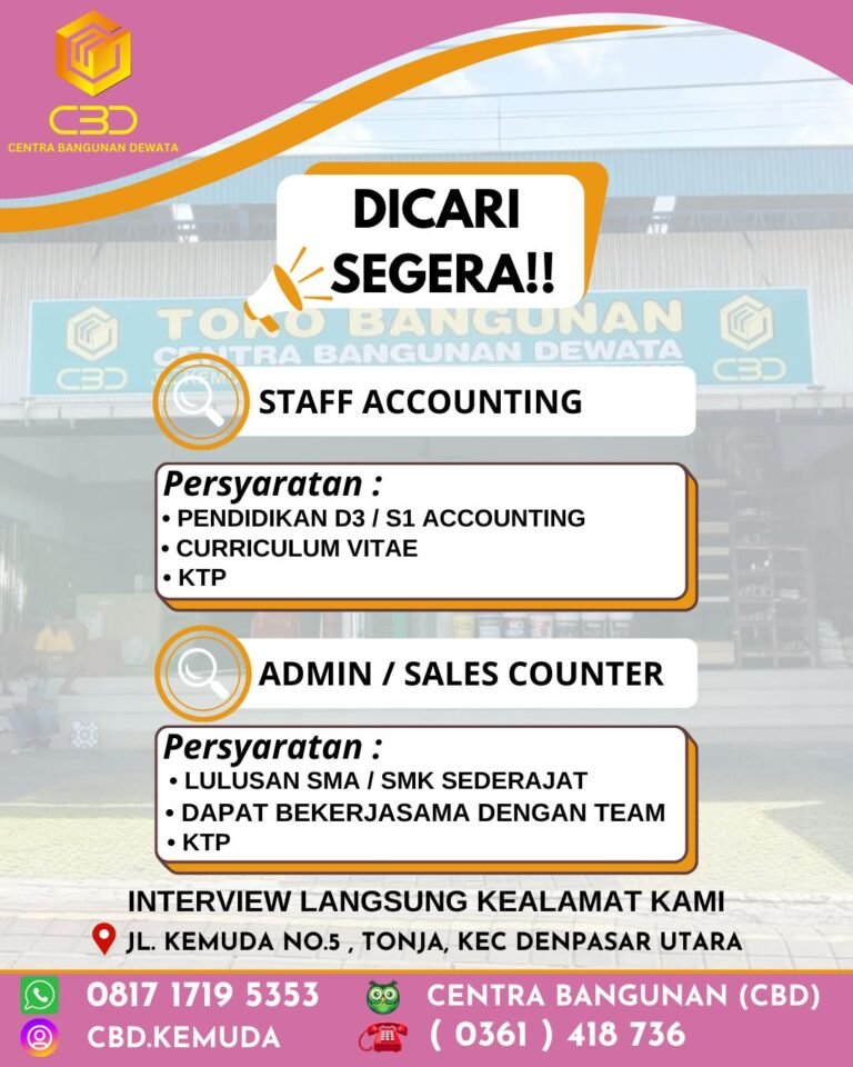 Denpasar – Centra Bangunan Dewata (CBD), salah satu toko bangunan yang berkembang pesat di Denpasar, mengumumkan pembukaan lowongan kerja untuk dua posisi strategis: Staff Accounting serta Admin/Sales Counter. Rekrutmen dilakukan guna mendukung peningkatan kebutuhan operasional dan pelayanan toko.