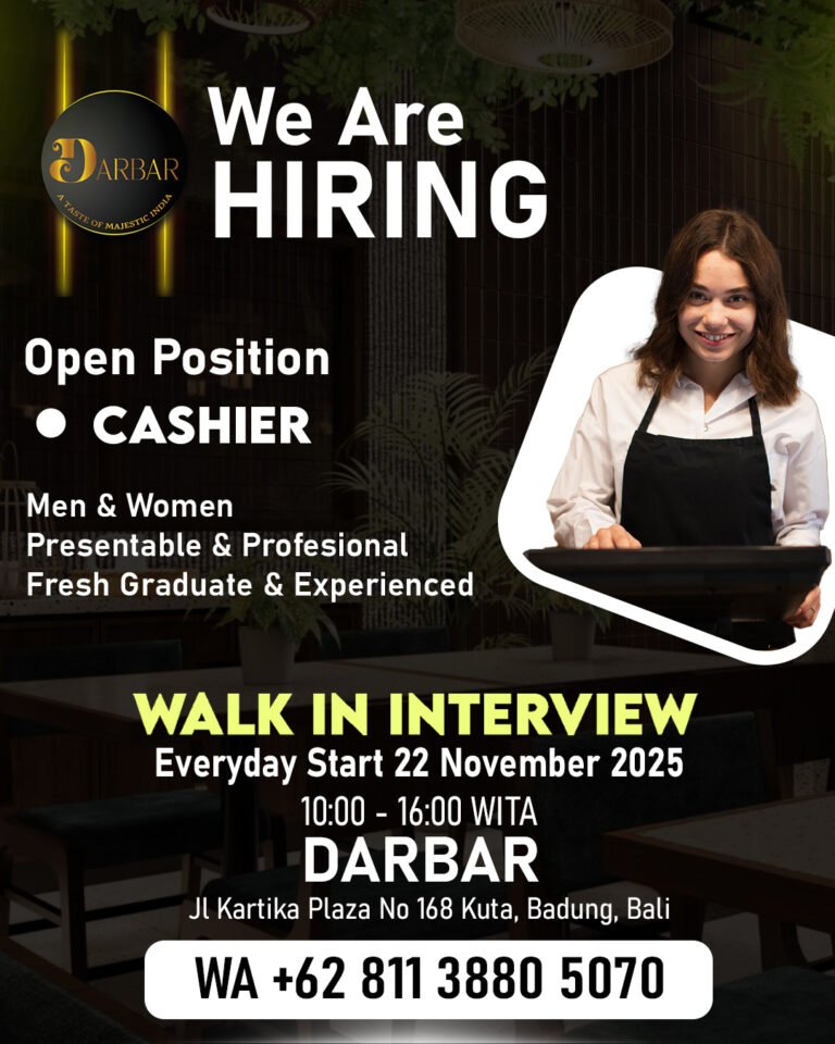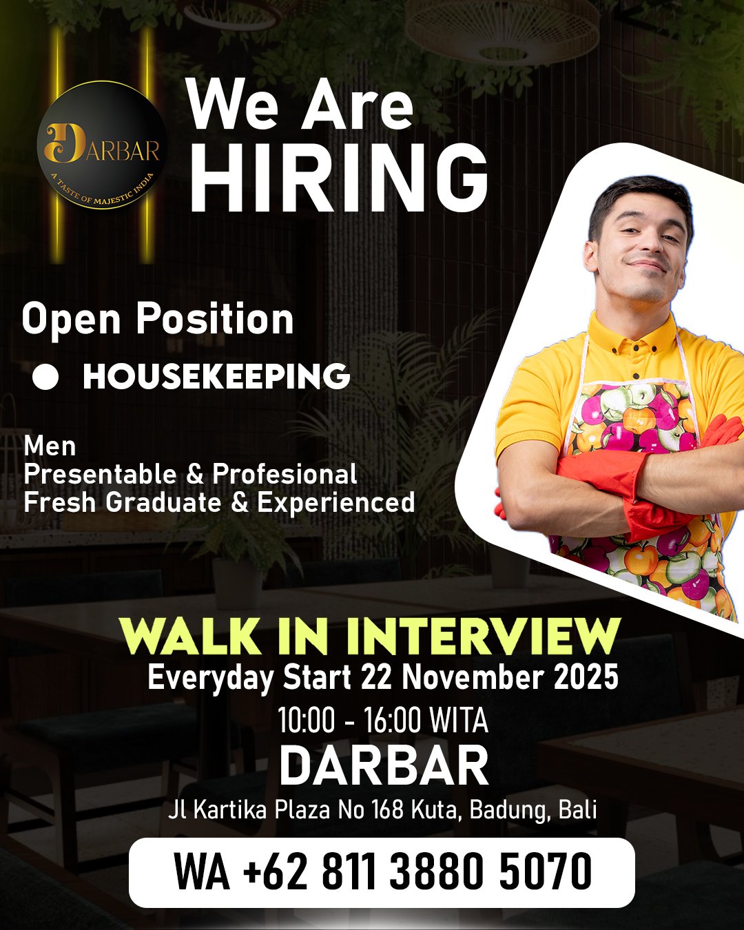 Restoran Darbar Bali membuka perekrutan untuk tiga posisi utama:
