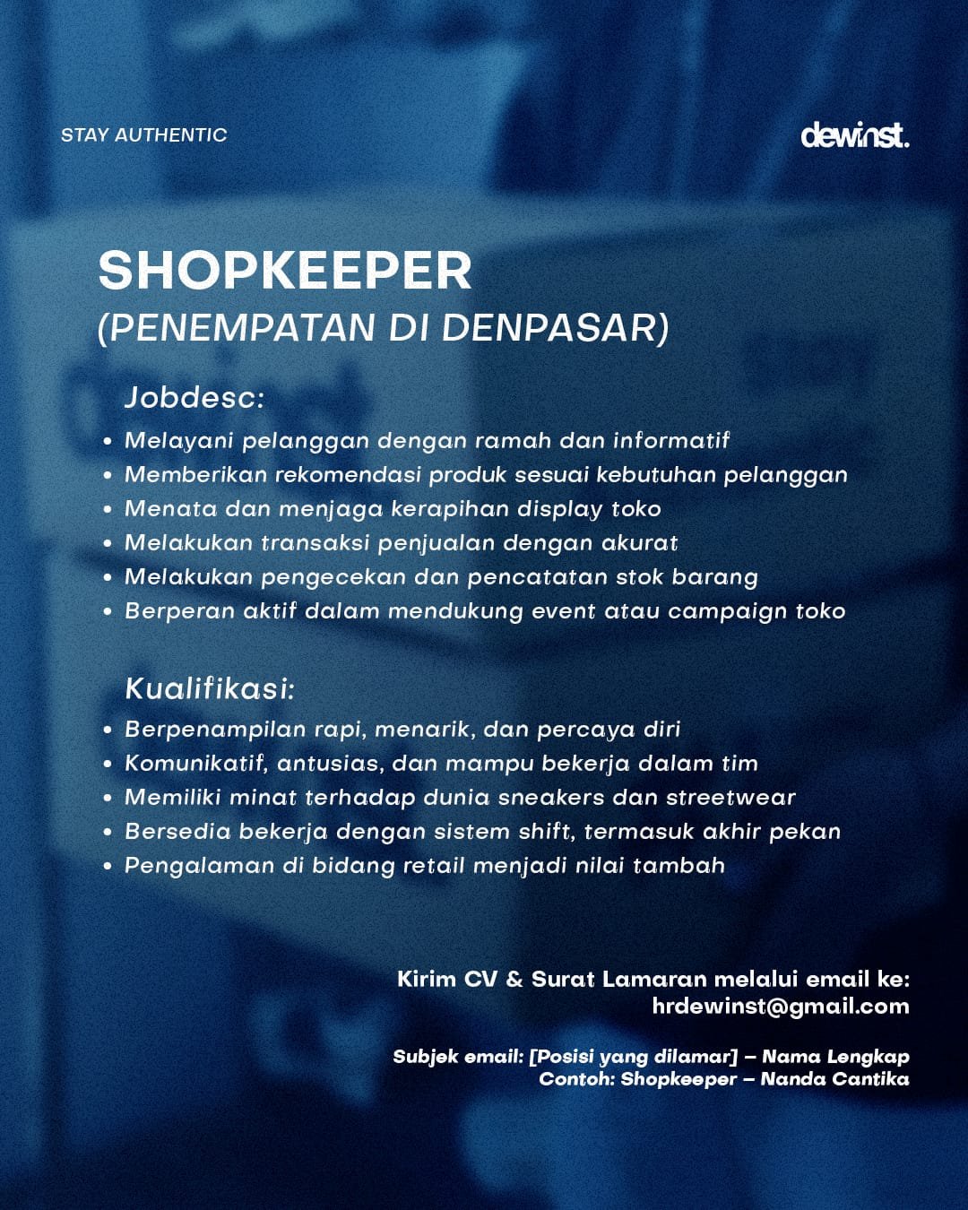 dewinst. membuka dua posisi penting untuk penempatan di Denpasar: Shopkeeper dan Akuntan Keuangan. Perusahaan ini mencari individu yang bersemangat di bidang sneakers dan streetwear untuk posisi Shopkeeper, serta profesional yang teliti di bidang akuntansi.