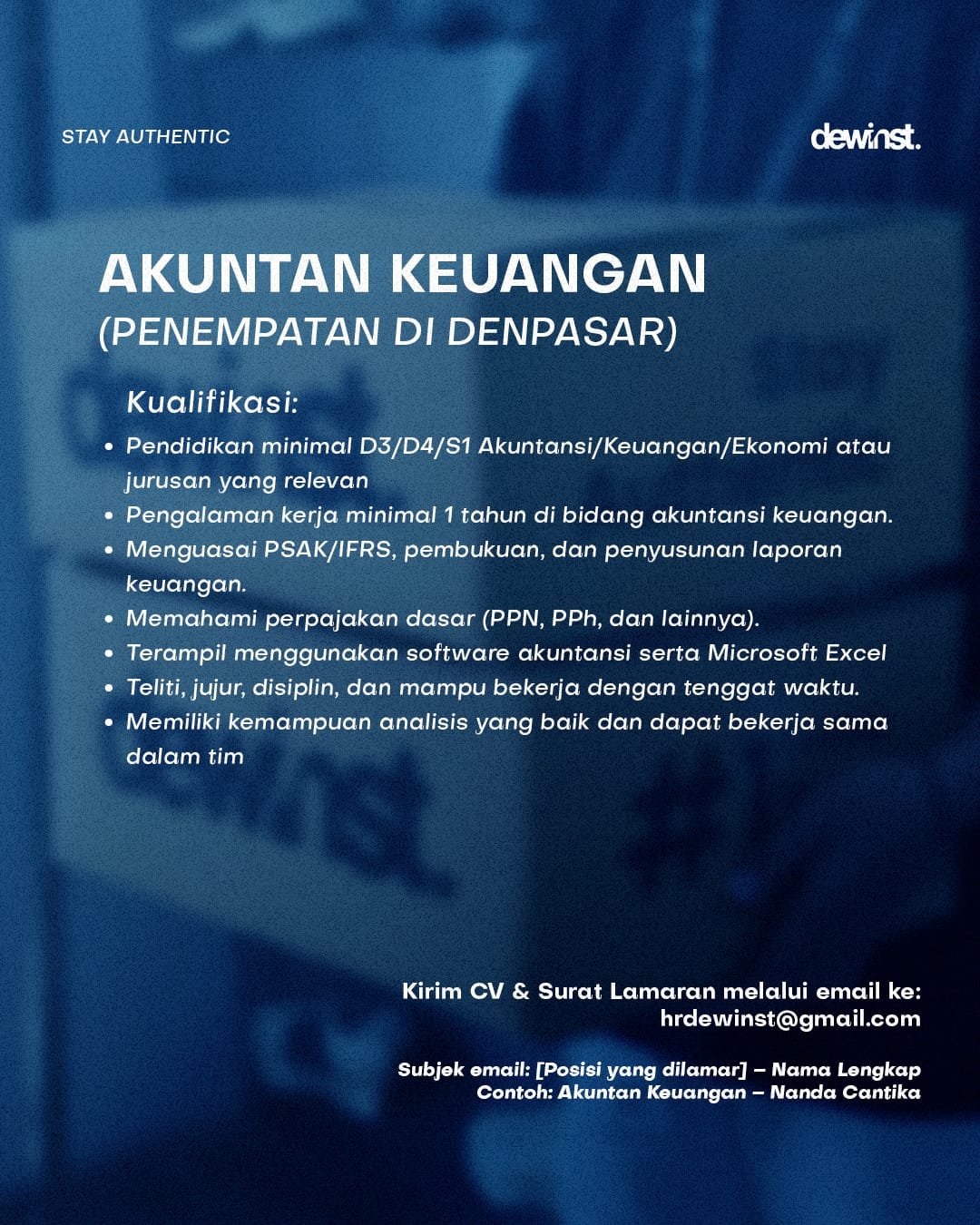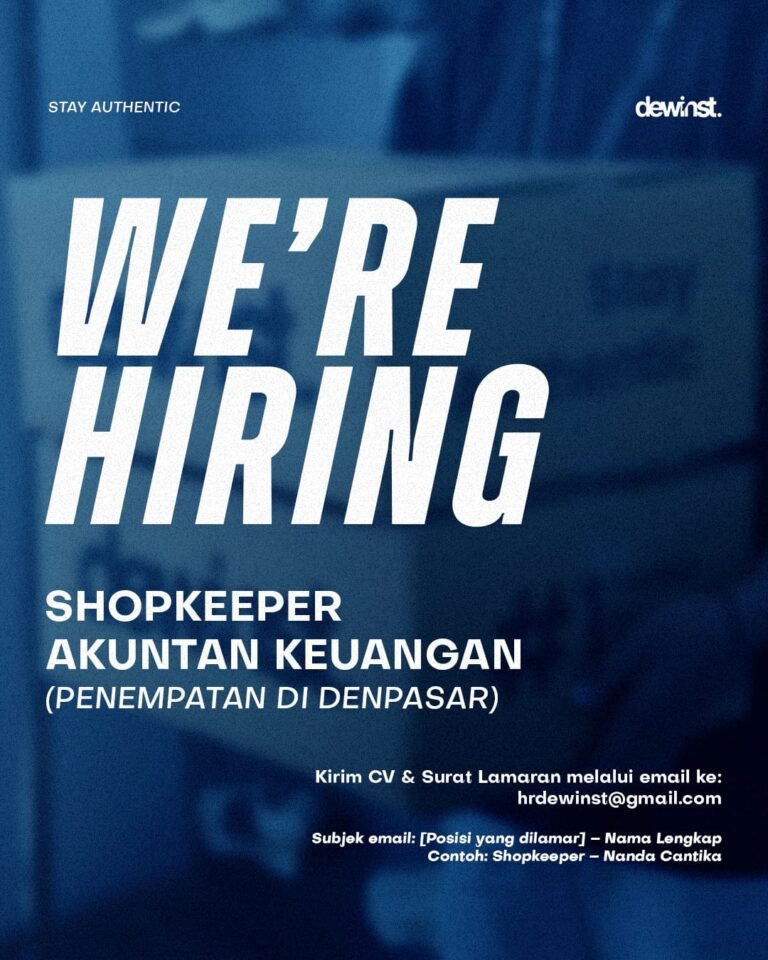 dewinst. membuka dua posisi penting untuk penempatan di Denpasar: Shopkeeper dan Akuntan Keuangan. Perusahaan ini mencari individu yang bersemangat di bidang sneakers dan streetwear untuk posisi Shopkeeper, serta profesional yang teliti di bidang akuntansi.