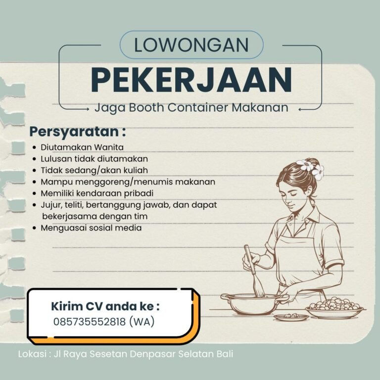 Sebuah warung/usaha makanan di Denpasar Selatan membuka lowongan pekerjaan dan membutuhkan staff untuk posisi Jaga Booth Container Makanan secepatnya. Lowongan ini terbuka bagi individu yang diutamakan wanita, rajin, dan mampu bekerja sama dalam tim.